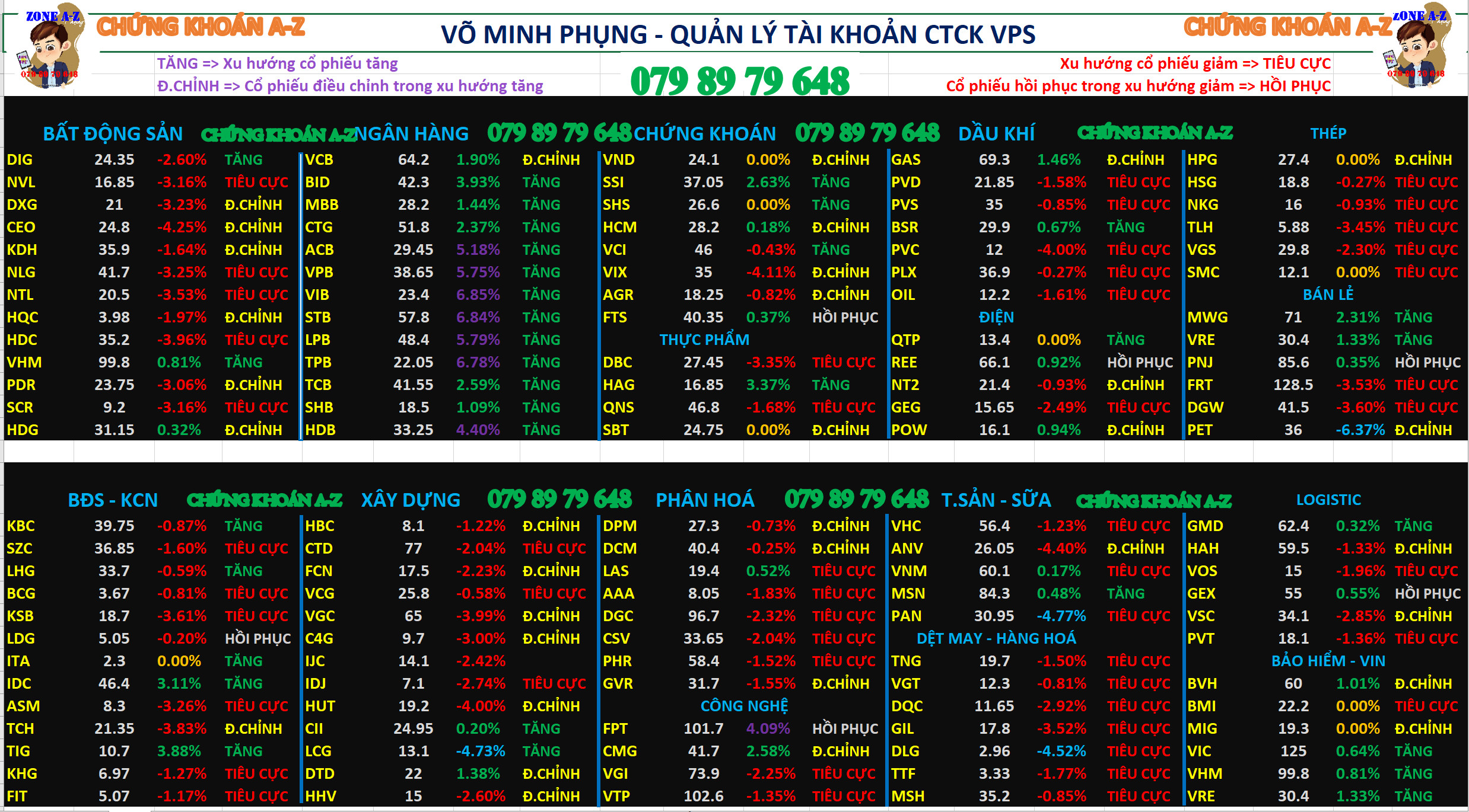 BĐS KCN cũng tương tự, nhiều mã giảm: KBC -0.87%, SZC -1.60%, KSB -3.61%.
